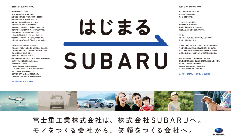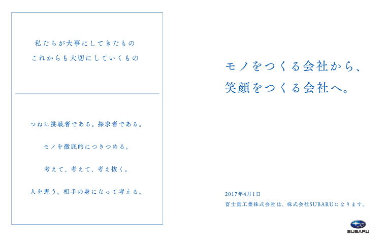 会場では、これまでの「富士重工業」がなしてきたことと、これからの「SUBARU」がなすべきことをうたいあげたリーフレットが社員全員に配布されました。これと同じ内容が2017年4月3日(月)、全国の新聞朝刊に広告として掲載されました。吉永社長は繰り返し「社名変更は決意表明」と述べていましたが、「モノをつくる会社から、笑顔をつくる会社へ」という強い決意が、その見開き2ページにわたる全30段の新聞広告(レポート冒頭のイメージ)に大きく掲げられたものを皆さんもご覧になったのではないでしょうか。