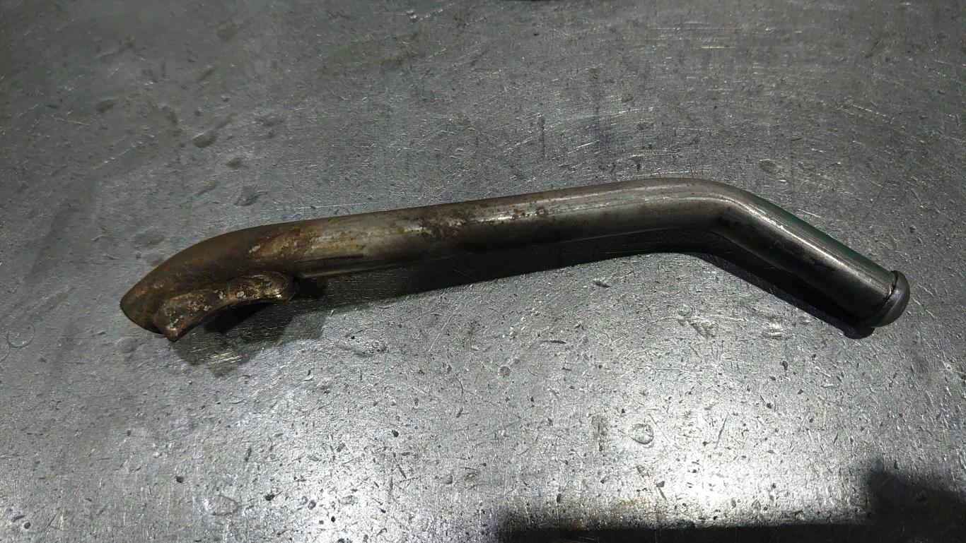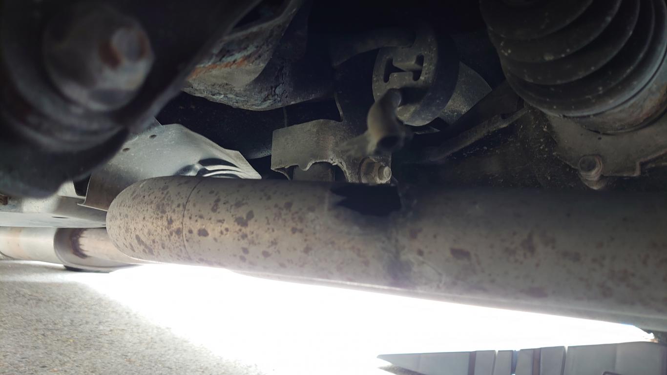 当初、「中間マフラーのハンガー割れているよ~」って話だったのでひび割れ程度だと思っていたのですが下回り潜り込んで見てみたら完全に割れてもげていました・・・(´;ω;`)